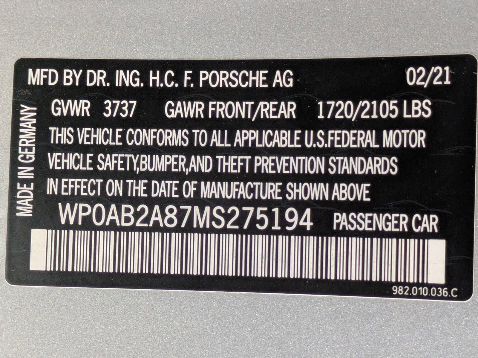 Contact AutoNation USA Centennial today for information on dozens of vehicles like this 2021 Porsche 718 Cayman S. This Porsche includes: WHEELS: 20 CARRERA Tires - Front Performance Aluminum Wheels Tires - Rear Performance LOWER REAR FASCIA IN EXTERIOR COLOR PORSCHE ENTRY Keyless Start Hands-Free Liftgate Power Door Locks Keyless Entry Remote Trunk Release SMOKING PACKAGE BOSE SURROUND SOUND SYSTEM Premium Sound System POWER STEERING PLUS PASM SPORT SUSPENSION Active Suspension TRANSMISSION: 7-SPEED PORSCHE DOPPELKUPPLUNG (PDK) Transmission w/Dual Shift Mode 7-Speed A/T A/T WHEELS PAINTED IN SATIN BLACK SPORT CHRONO PACKAGE GT SPORT STEERING WHEEL Leather Steering Wheel GT SILVER METALLIC INTERIOR TRIM IN LEATHER IN INTERIOR COLOR BI-XENON HEADLIGHTS IN BLACK W/PDLS HID headlights Headlights-Auto-Leveling SPORT TAILPIPES IN BLACK 14-WAY POWER SPORT SEATS Mirror Memory Seat Memory Power Passenger Seat Adjustable Steering Wheel Power Driver Seat Passenger Adjustable Lumbar Driver Adjustable Lumbar Bucket Seats CLEAR TAILLIGHTS *Note - For third party subscriptions or services, please contact the dealer for more information.* You deserve a vehicle designed for higher expectations. This Porsche 718 Cayman S delivers with a luxurious, well-appointed interior and world-class engineering. The Porsche 718 Cayman S will provide you with everything you have always wanted in a car -- Quality, Reliability, and Character. There is no reason why you shouldn't buy this Porsche 718 Cayman S. It is incomparable for the price and quality. This vehicle includes a Money-Back Guarantee* and has passed our precise inspection process. What does that inspection include? Our Worry Free Folder is in each vehicle and includes the complete inspection, along with the work that was completed to bring the vehicle up to AutoNation standards. A copy of the CarFax has also been included for you. Best of all the price you see is the price you pay. No haggling. No back and forth. No pressure. *Money-Back Guarantee is valid for 5 days or 250 miles, whichever comes first. Subject to certain terms and conditions. See store for details. Some restrictions apply.
